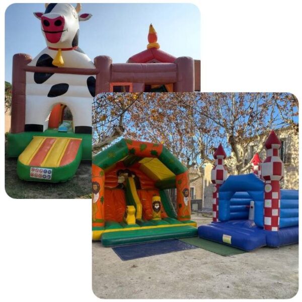 Pack de 3 : Château gonflable « La Vachette », château gonflable toboggan « Le Roi Lion » et château gonflable « Objectif Lune » pour une remise de -20% sur le prix habituel.